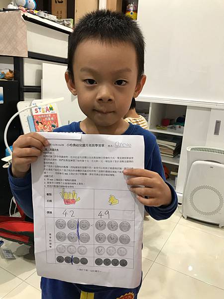 哥哥還沒上樓就拿出點餐學習單在飯廳開始寫作業,以迅雷不及掩耳的速度把餐點需要的硬幣,用藍筆勾好了一個選項。然後,在媽咪還沒回過神來時,用很快的速度畫了「薯條」和「雞塊」。到了小書房後,第一次不用催促,就繼續學習單的內容,著色並寫上餐點價錢後,幾乎就完成第一項作業~太令媽咪驚呼了!