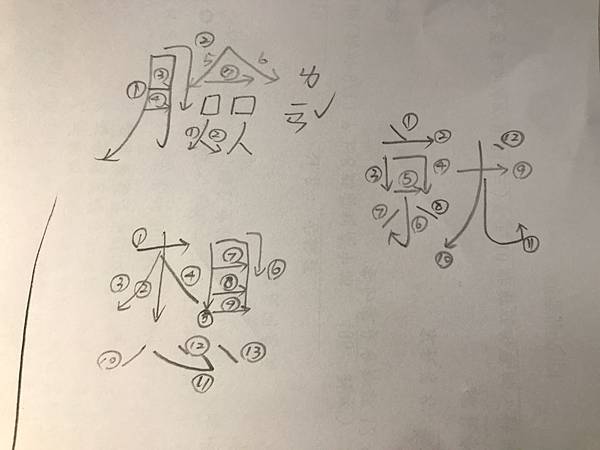先後找到了「因 一ㄣ」→「明ㄇ一」→「臉ㄌ一ㄢˇ」→「想ㄒㄧㄤˇ」→「就ㄐ一ㄡˋ」→「二ㄦˋ」。六個字中就有四個字的筆劃超多,為了讓哥哥寫字有正確的筆畫順序,在空白紙上寫上大大的國字,並在旁邊標註12345來表示順序,哥哥就依樣畫葫蘆的寫在學習單上,基本上整體來說還算可以,只是可以找簡單筆畫的國字就好嗎?